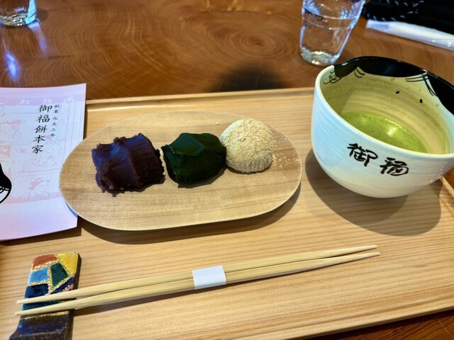 おすすめ3種盛りは抹茶付きで、お福餅、お福餅抹茶、包み餅きな粉の3種盛り合わせ。