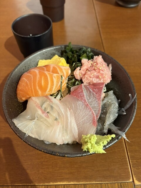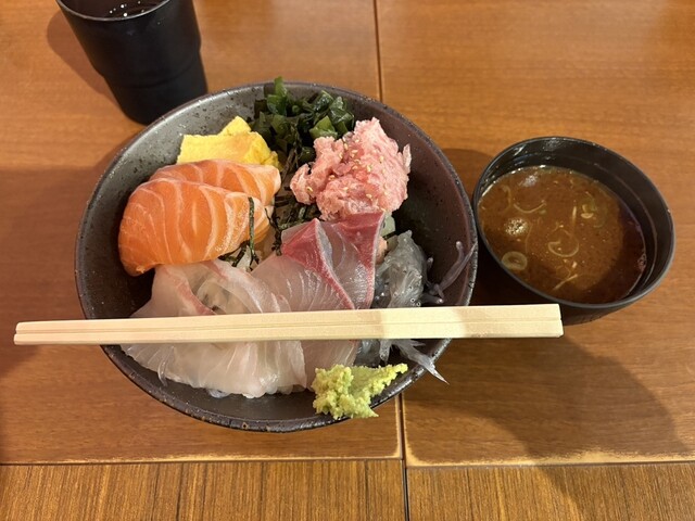 日替わり海鮮丼を注文、このボリュームで1,300円は破格です(しかもご飯大盛りは無料です)。