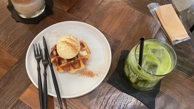 アイスの抹茶ラテ、ワッフルにアイスをトッピング。ひとくち食べたとき、ワッフルってこんなに美味しかったっけ?日が経ってもあの美味しさを忘れられない。某有名コーヒーチェーンのワッフルと比較してしまうと、優しくて癖になる甘み、サクモチの食感、軽いけど小腹が満たせる等全てがうえを行く。正直これからどこかで他のワッフルを食べても比べてしまうと思う。それにアイスクリームもしっかりこだわってるんだなーって、感動する美味しさ。全てのバランスが完璧だった。これはまた食べに行きたいって思う。カフェのフードでは珍しいレベル。