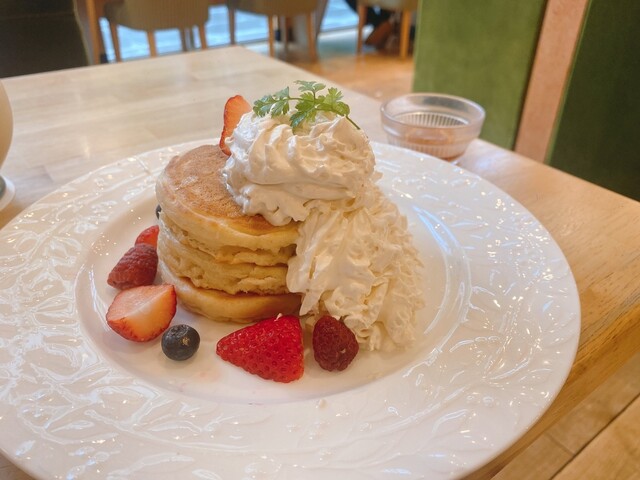 思いっきり甘いパンケーキが食べたかったので,イチゴの乗ったパンケーキにしました。パンケーキはふんわりしているわけではなく、しっかりした生地でした。生クリームは甘くて、ほんのり甘いパンケーキ生地にぴったりでした。
