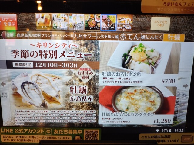 キリンシティさんのフェアでやってる旬のお料理が大好きで、今回は迷った挙句に牡蠣とほうれん草のグラタンを注文。ちょっと待ちましたが、熱々で大きな牡蠣が3個も入っていて大満足でした。