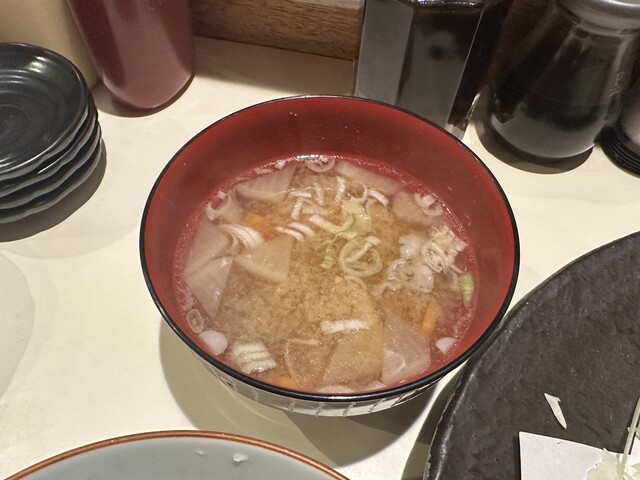 豚汁はしっかりした味付ながら、脂っぽくなく飲みやすい。