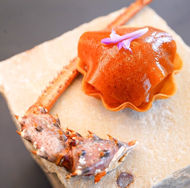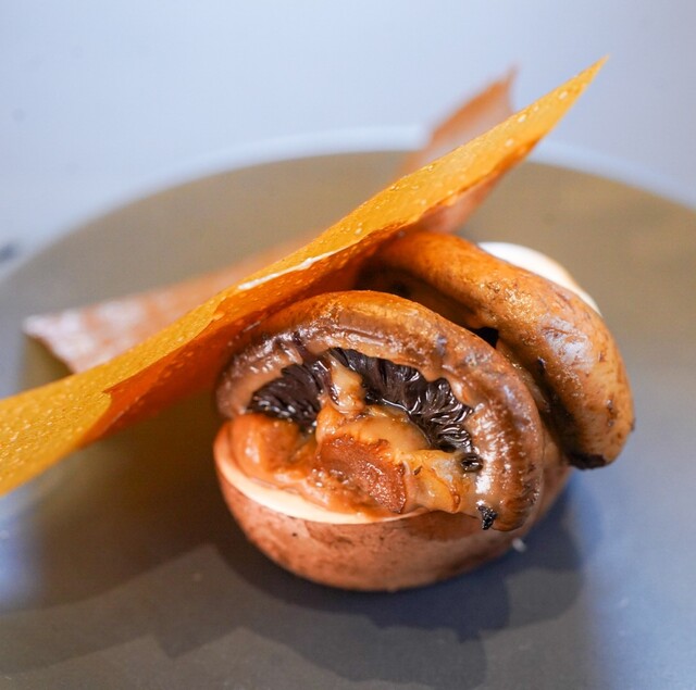 →ヤマドリダケのフリット。アワビの肝を使って黒土を表現して、森の地面を想像させてくれる。サクサクと柔らかトロリ。一口でたくさんの発見があります!