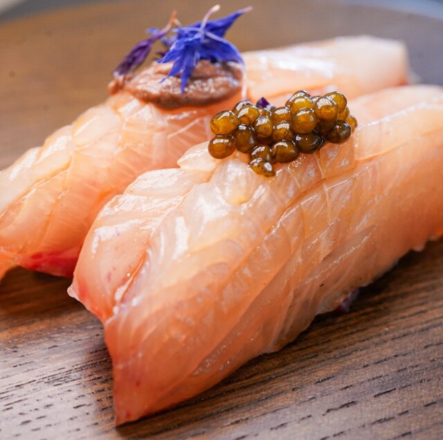 →燻製されたようなスモーキーな香りが響くシマアジのお寿司。自家製お酢を使用し、魚醤やキャビアの風味が素敵です。
