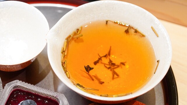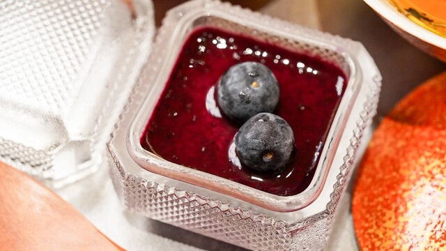 濃厚で濃いパンナコッタ。ブルーベリー感しっかりで、合わせるほうじ茶も心地よい。