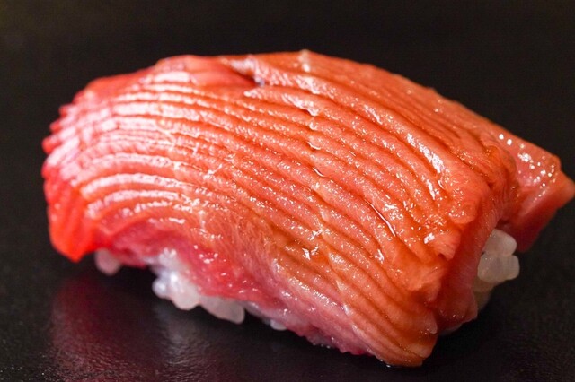 なめらかに口全体に流れるトロトロマグロ、中トロの旨みがなめらかにずっと広がる。繊細な包丁の飾りでツヤがさらに美しくなります。