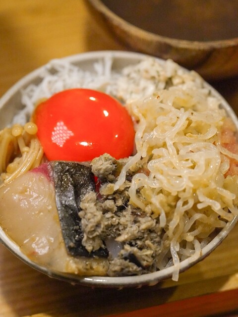 シラスなめ茸長芋納豆鰆付鰆フレーク明太搾菜白岳ペペロン卵黄全部乗せ!