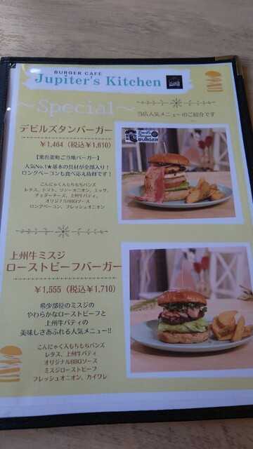 隣町のカラオケ「Jupiter(ジュピター)」で出している上州牛を使ったデビルズタンバーガーを中心に、いろんなバーガーメニューがありました。