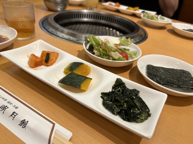 明月館さんの焼肉ランチは、選べるスープ、キムチなどの一品料理、サラダ、焼き海苔、バラ肉、おかわり無料の白ごはんがセットになっています。