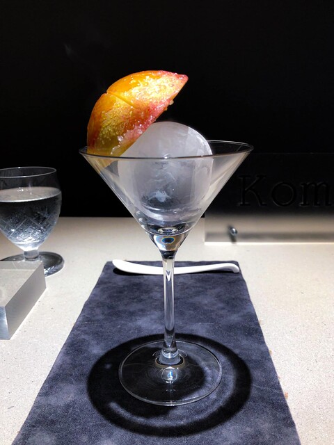 球体の氷に置く事で、温かな桃を点で冷やす。