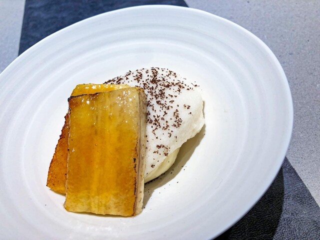 ・カカオパルプの泡 クレームディプロマット エクアドルのコーヒー キャラメリゼしたバナナ