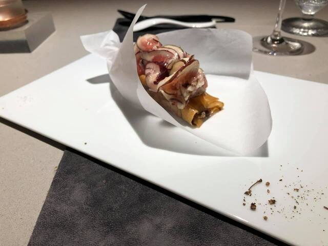 ・いちじく シャンパンゼリー 皮ごと自然の色のいちじくピューレ 和栗のマロングラッセ イチジクの香りがぶわーっと! 下のシャンパンゼリーとの相性も良き。 とってもいい香りのする一皿。