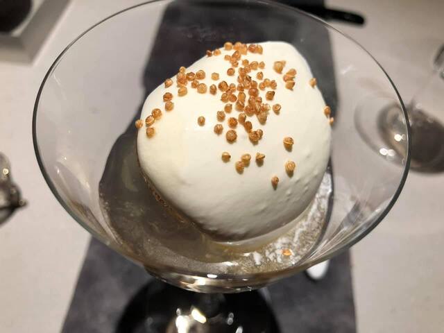 ・利平栗のバシュラン メレンゲ 生クリーム 夏蜜柑のコンフィ角切り エスプレッソのジェラート 渋皮煮を濾して作ったマロンクリーム おおがの利平栗。 フチにのせた、渋皮を乾燥して粉にして焼いたおせんべいまでうまい!