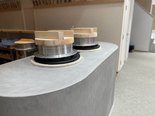 お店に入ると、カウンターの前でもくもくと炊き上がっている羽釜が鎮座。