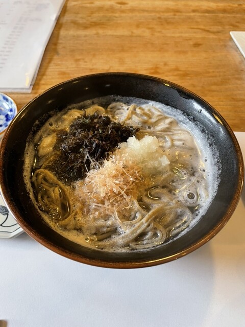 出雲そばは、そばの実と甘皮まで全て挽いた「挽きぐるみ」と]呼ばれている蕎麦粉を使用しています。色が濃く風味を楽しめます。
