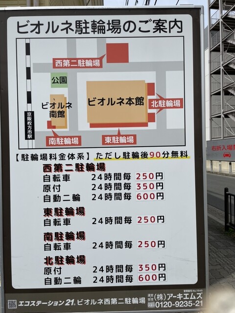 ミニバイク、自転車の場合ビオルネの駐輪場は90分無料です。