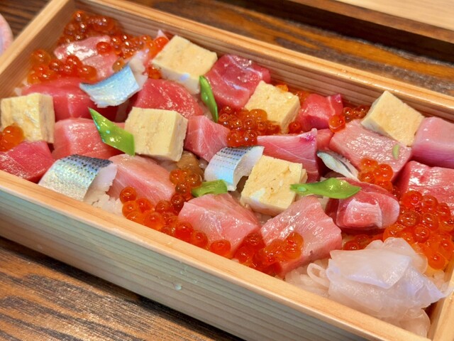 口溶けの良いトロや、大粒のイクラなどの海鮮、アクセントのお野菜や、優しいお味の卵焼きが、ふんだんに散りばめられ、ボリューム満点。