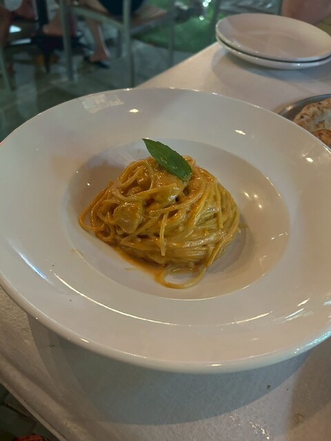 新鮮なウニが贅沢に使われていて、トマトクリームと白ワインのソースが甘みとコクを引き立てます。ガーリックの風味も程よく、海の香りが広がる逸品。