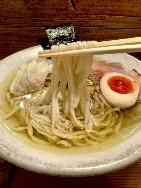 塩に合わせる自家製麺は写真の通り中太縮れタイプで前に深谷さん言ってたけど、中太縮れの方がスープを掬い上げるので推奨との事、凄〜く良い麺◎ 勿論、細麺指定での注文も可。