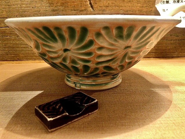 またトッピングの配置は定型ではないので、今日は真ん中寄りに味玉、メンマと九条葱、黒豚雲呑と海苔3枚をベースとし、麺を左側で見せ、チャーシューと本枯節を右に添えた形。