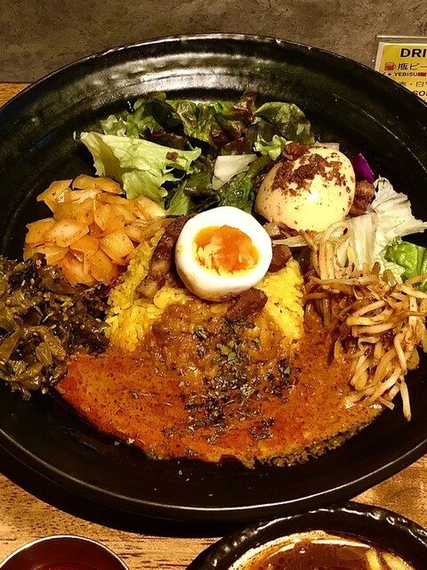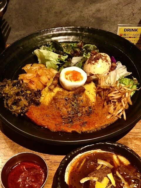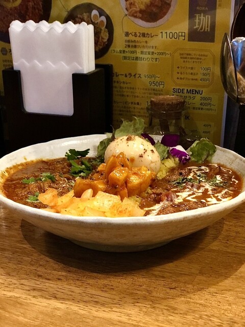 注文は「オマール海老出汁カレー」の”ろかプレート”で、ライス中盛りに裏メニューのマスタードオイル高菜ともやしマシ、そして"るうろう煮玉子"&特製極辛マサラペーストと12/31日(水)限定「仔牛タンの年越し極上南蛮カレー」!
