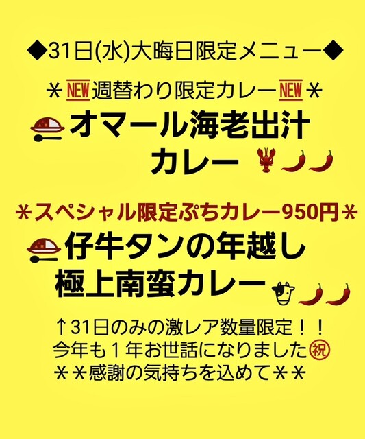 12/31日(水)限定「仔牛タンの年越し極上南蛮カレー」は「年内最終営業日。皆様の来年の健康を祈願致しまして年越しカレーをご用意させて頂きます⭐︎ 仔牛タンの中でも更にタン元の柔らかい所だけを厳選した採算度外視の大晦日スペシャルカレーで、高級かつお節で出汁を取り旨みUP&柚子の皮をアクセントにお召し上がり下さいませ。極上牛タンカレーは数量限定の為、店内でも途中で品切になる場合が御座いますので後半にご記帳頂くお客様予め御了承下さいませ」以上 by 魯珈