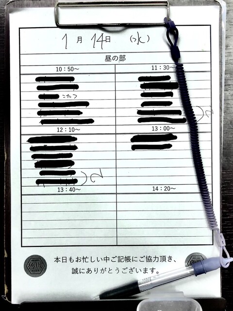 3人目でそのまま10:50枠の3枠目に記帳、10:45に魯珈に戻り、10:49から順に名前を呼ばれて入店。