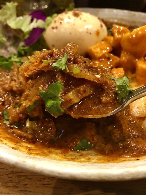 そして今日12/17(水)からの最新限定「牛バラ木耳麻辣湯咖喱」は、「牛バラ肉x木耳xほうれん草花椒の薫りと刺激的な痺れに薬膳系スパイスで体が一気に温まる辛口の麻辣湯風風のカレーで、薬膳+滋養強壮度高い系なので年末お疲れ気味の方や刺激を求める方にオススメ、更に刺激をお求めの痺れスキーの方には◆シビ辛増し+50円 ◆鬼シビ増し+100円 も出来ますのでお気軽にお申し付け下さいませ」