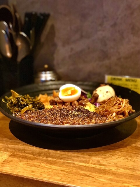 注文は限定「BISTRO黒胡椒キーマカレー」のろかプレートにライス中盛り、マスタードオイル高菜ともやしをマシ&るうろう煮玉子。なお黒胡椒マシが出来るとの事でお願いしました。
