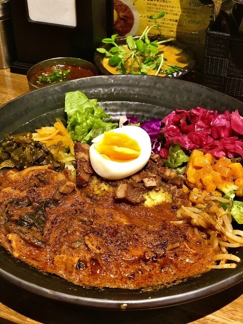 注文は6/2以来の限定「激辛角煮カレー超~SUPER~」のろかプレートで初のマスタードオイル高菜&副菜(もやしアチャール系)増しにるうろう煮玉子とライス中盛り。