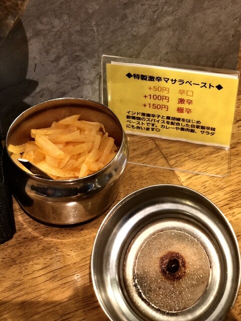 順番的には"ろかプレート"だけど気分はあいがけなので、ダブル限定の2種カレーにスパイス福神漬けを付け、いつもの特製極辛マサラペースト&るうろう煮玉子とオーダー。