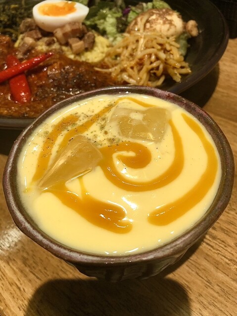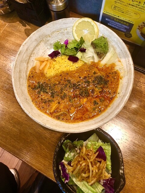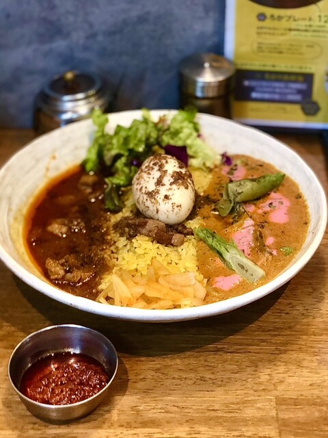 左の新作は春らしく桜の塩漬けをアクセントに3種類の豆をポタージュ状にして鰆と合わたカレー。円やかな味わいにトマトと生姜に大蒜も重なりめっちゃ旨〜い❣️