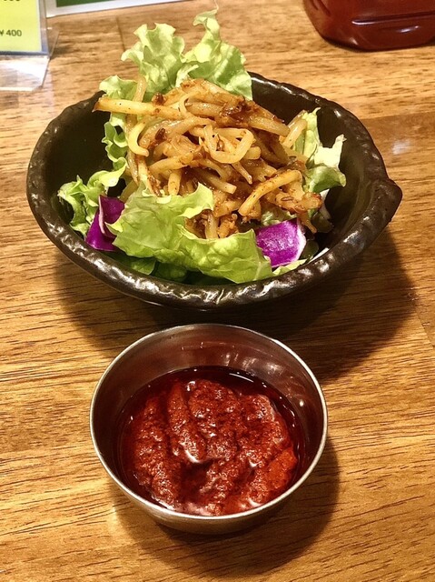 「辛ヤサイ250円」豆苗やネギに水菜を自家製辣油とスパイスで和えた薬味的アイテム。