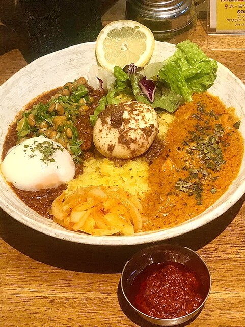 注文は限定2つの2種カレーに茄子のアチャールとるうろう煮玉子に特製極辛マサラペーストを追加。