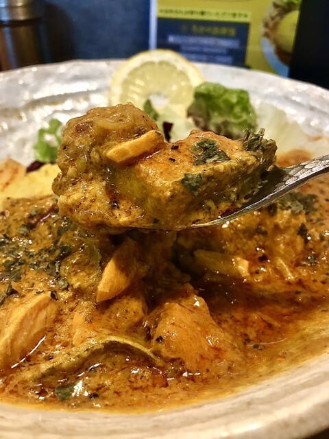 「アチャーリーサーモンカレー ~レモンを添えて~」は6/11(水)から始まった限定で、「マンゴーやライムに青唐辛子のアチャールとカシューナッツをミキサーでペーストにしてタマリンドの酸味も加え、シナモンやフェンネルにココナッツ等を使った爽やかな創作系フィッシュカレー(途中からレモンで味変)」By 魯珈