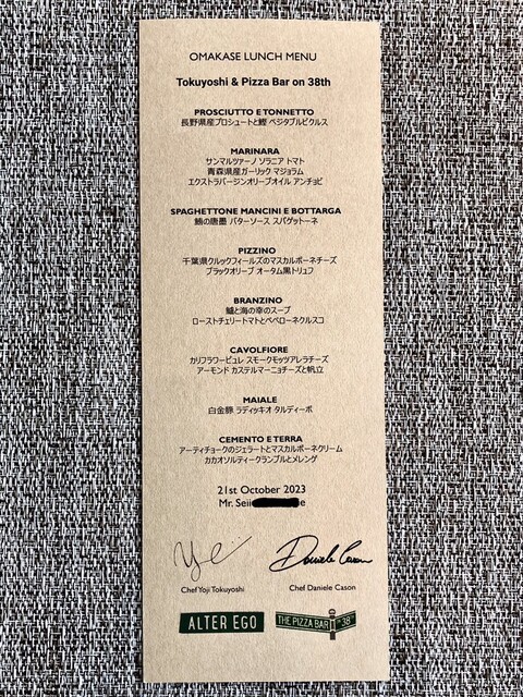 去年10/21(土)に「38th×徳吉洋二 特別コラボレーションメニュー」として、38th及びMandarin Orientalのエグゼクティブシェフ・Daniele Cason氏と、ミラノ「Ristorante TOKUYOSHI」と神保町「Alter Ego」のオーナーシェフ・徳吉洋二氏とのコラボによる8品の24名様限定特別メニューに伺った以来の訪問。