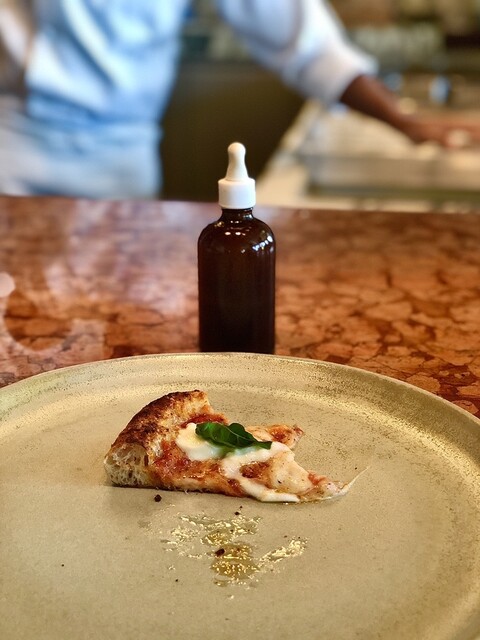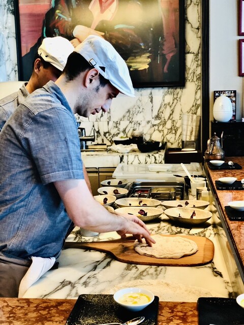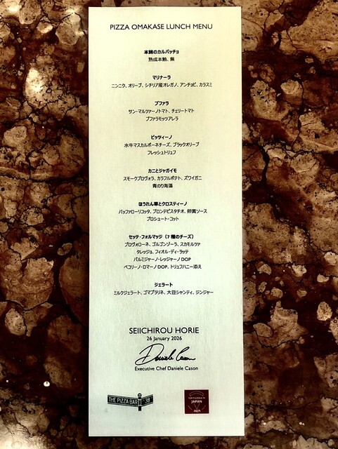 シェフはマンダリンオリエンタル東京エグゼクティブのダニエレ・カーソン、オープンキッチンスタイルで目の前でピザを作り窯で焼き上げ提供されるのはローマンスタイルのピッツァで、それらを寿司屋にインスピレーションを得たという「おまかせ」のコース仕立てにしているのが特徴。