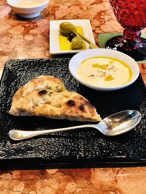 水牛マスカルポーネチーズなど4種のチーズを挟んだ自家製フォカッチャ、ブラックオリーブ、サマートリュム掛け