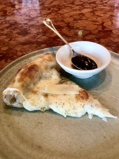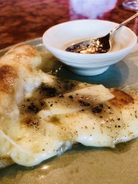 38thオリジナルで不動な人気の逸品で、水牛マスカルポーネチーズなど4種のチーズを挟んだ自家製フォカッチャ、沖縄産 はつかねぎ(二十日ネギ)を乗せた上にたっぷりのイタリア産トリュフ掛け。