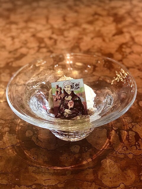 ジュラートマシーンでダニエレ・カーソン氏がその場で自ら作るオリジナルのジュラート、優しくとろける口当たりのジュラートで、ピッツァバー on 38thに飾られているピザピールを持ったモナリザに「I LOVE PIZZA」と記された絵を貼ったオリジナルのチョコ添え。