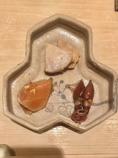 ・珍味3種、蛍烏賊、あん肝、赤伊佐幾