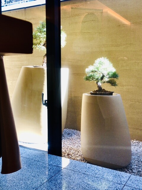 L字の美しい檜のカウンター9席(仕様でした今日は)の凛とした空間、正面の坪庭には松の盆栽がレイアウトされているのも趣深い。
