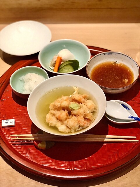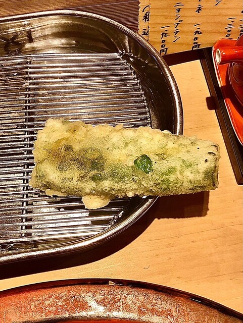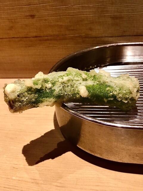 旬の魚介と走りの野菜を天種ごとに衣の加減を調整、温度の異なる二つの鍋を使い分け、時には中温から高温に移す二度揚げの技術で移り行く四季の味覚を表す滋味深い天ぷらを提供。