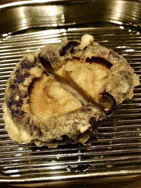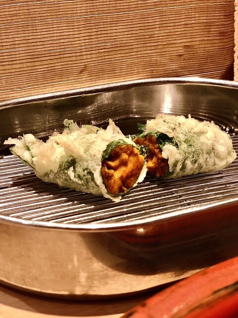 薄い衣をまとわせ太白胡麻油で揚げるのは食材を引き立たせ、特に大葉で包んだ雲丹の天ぷらは加熱により香りと旨みを引き出すスペシャリテ。