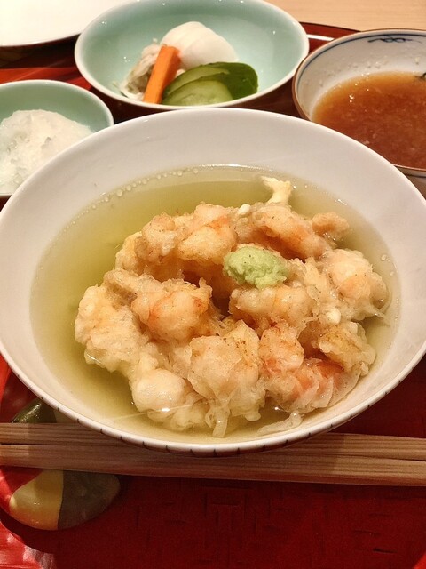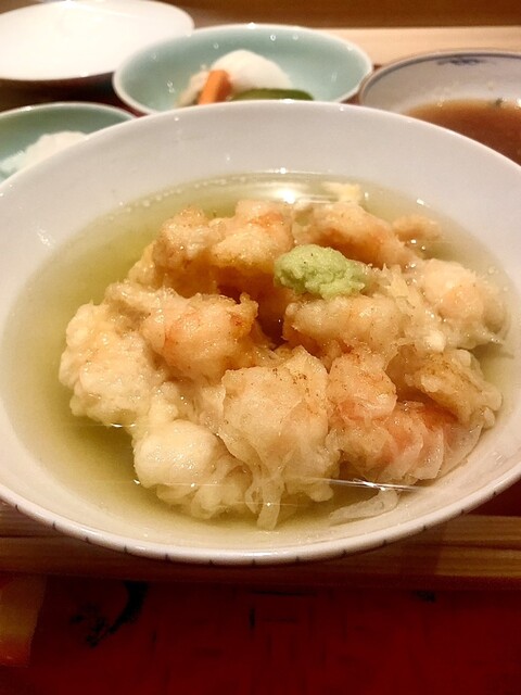 前回は天丼にしたので今回は天茶にしたら大正解、海老中心のかき揚げがほろほろ崩れ、茶漬けにも海老の油などが染み、繊細かつ旨味たっぷりの天茶に◎