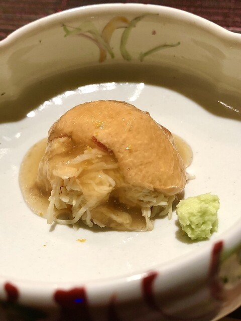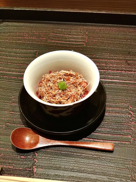 松葉蟹と道産余市あん肝の繊細な旨味に柚子の爽やかなジュレが上品、柚子というのが本当良いく好みドンピシャ。