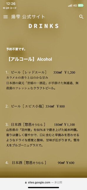 TableCheckでの予約時に注文も決めるのでお店にあるメニューはドリンクのみ。