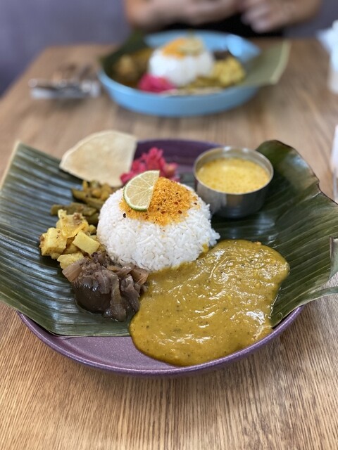 桃活中の友人に同行しました。中山駅から歩いてすぐのところにあります。店内は一階がドライフラワーでいっぱい温かい雰囲気でとてもおしゃれ。二階でパフェ(スリランカカレーとパフェのコース)、離れ?ではかき氷をやっているようです。今回は予約して行きました。4800円、自分へのご褒美ランチです。スリランカカレーは本格的ですが辛さはは全くなし。エビカレーは風味豊かで美味しいです。ドリンクはマンゴーラッシーを注文、濃厚です。そしていよいよ最後のパフェ。パフェを作っているところを見られるようになっているのですが、作っていく工程がとても面白く、釘付けになりました。他のお客さんの分も作っているので、10個程の桃パフェを同時に仕上げていくところは拍手モノ!(スタッフが映ってしまうので写真は撮れませんでした残念です)出来上がった桃パフェはもはや芸術作品。ほうじ茶ジェラートが上のっていて、食べ進めていくと食感も変化してさらに美味しく感じました。