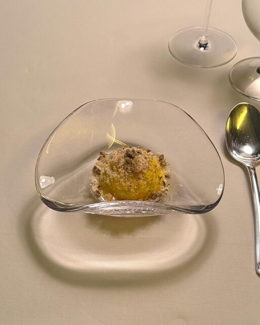 一品目から紅葉かわいぃ〜 毛蟹の甘さとつや姫米ムースの旨みとホタテ(パウダー)の掛け合い、期待が高まるシグネチャーメニュー。四季によってビジュアルが変わるからコンプしたくなるねぇ