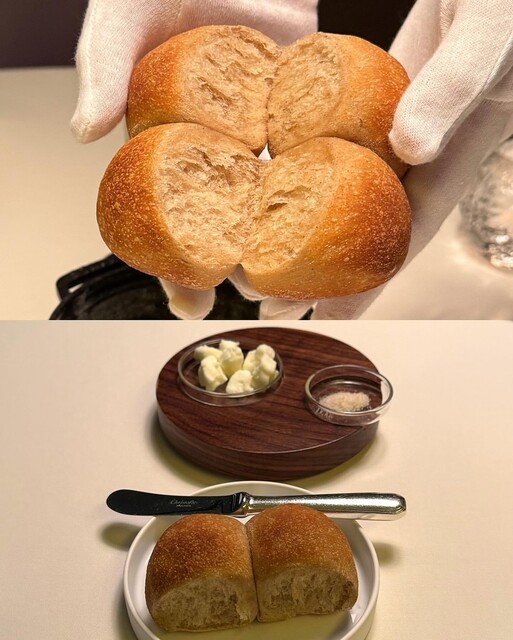 パンは来店時間に合わせて焼き上がるように準備されているそう、、!手で割いたときの小麦の豊かな香りが忘れられない〜 カリモチで自家製バターとの相性抜群。コース内のパンはお店のレベルを連想させるから大事 ⟡